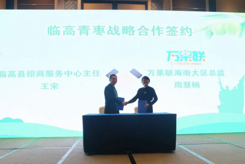 “驰枣开芯”品牌发布后,万果联海南大区总监周慧楠与临高县招商服务中心主任王宋共同签署战略合作协议。双方将围绕品牌推广、产销对接、优势资源共享等多个方面展开全面、深入的合作,赋能临高农特产品,助其走得更远,更快。