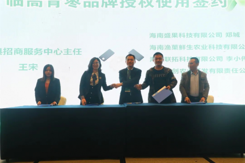 海南盛果科技有限公司代表郑城、海南渔菓鲜生农业科技有限公司代表孔德俊、海南联拓科技有限公司代表李小伟、海南黎创农业开发有限责任公司代表何学芳与临高县招商服务中心主任王宋共同签署品牌授权使用协议,成为首批“驰枣开芯”商标使用者。