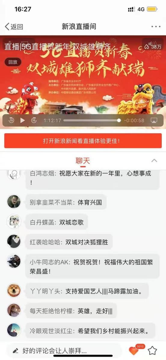 这是在广东省云浮市新兴县天堂镇朱所村,“5G直播贺新春 双省城雄狮齐献瑞”的乡村体育活动直播,同步在广东移动粤享5G、南方+、新浪直播、微赞平台直播。这是一场利用5G直播新技术展示美丽乡村和乡村体育文化的新尝试,吸引了超过100万网友观看。借助中国移动5G网络,美丽乡村跃上直播舞台,乡村振兴的成果将更丰富更立体地展现在互联网世界。